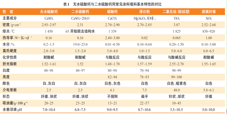 我國硫酸鈣(石膏)礦的儲量豐富,在世界各國儲量的前列。其作為無機(jī)非金屬礦的一種,同碳酸鈣、滑石粉、石英等一樣也有廣泛的應(yīng)用。填料的大多數(shù)性質(zhì)都是由其本身的結(jié)構(gòu)、組成等決定的。一般硫酸鈣用作涂料填料以無水硫酸鈣及二水硫酸鈣居多,表1 是無水硫酸鈣與二水硫酸鈣同幾種常見涂料填料基本特性的對比。