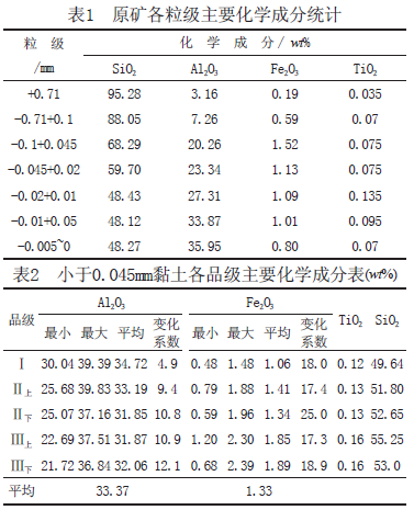 要為礦體頂?shù)装宓膶訝?、似層狀黏土巖和粉砂巖,部分為似層狀含礫不等粒長(zhǎng)石石英砂巖,夾石主要為黏土巖。礦區(qū)屬?zèng)_積盆地,礦體賦存于當(dāng)?shù)厍治g基準(zhǔn)面以下,礦體平均厚40~60m,覆蓋層厚度4~10m。原礦平均化學(xué)成分(wt%) 為:SiO2,87.72 ;Al2O3,7.99 ;Fe2O3,0.27 ;TiO2,0.13 ;K2O,0.51 ;Na2O,0.04 ;CaO,0.07 ;MgO,0.05 ;MnO,0.01 ;灼燒量,2.53。屬硅高鋁低礦體。