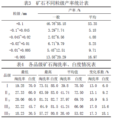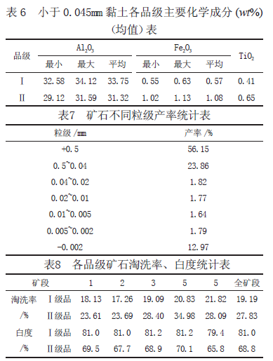 平均品位(-325 目):精礦率20.11%,白度60%~80% 左右,Al2O3 30.91%,TFe2O3 1.02%。粒度:原礦粒度峰值分布于+0.2mm 和-0.01mm兩個(gè)區(qū)間,-0.045mm 粒級(jí)一般占原礦的20%~40%,基本為黏土礦;-0.002mm 粒級(jí)含量一般在6%~7%,0.045~0.2mm 粒級(jí)占10%~20% ;+0.2mm 粒級(jí)占40%~60%。白度:Ⅰ級(jí)品原礦78%~84.4%,精礦(-325目)77.8%~84.6% ;Ⅱ級(jí)品原礦59.4~67.7%,精礦(-325目)64.7%~69.1%,可漂性好,可提高6%~8%。塑性指數(shù):原礦7~10,可塑性弱;精礦(-325 目)15~22,可塑性好。耐火度:原礦1680℃ ~1690℃,精礦(-325 目)1630℃ ~1770℃。