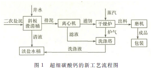 以二次鹽泥為原料,經(jīng)過(guò)斜板澄清桶稠厚、洗氯后,送至離心機(jī)脫水,脫水后的二次鹽泥送入干燥爐烘干,干燥爐出料經(jīng)磨粉機(jī)粉碎、篩選制成合格的超細(xì)碳酸鈣,然后成品超細(xì)碳酸鈣進(jìn)行包裝。