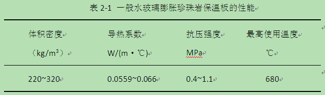 水玻璃膨脹珍珠巖保溫板是以膨脹珍珠巖為輕質(zhì)骨料,一定模數(shù)的水玻璃為粘結(jié)劑,并輔以適量的防水劑,按配比混合,經(jīng)成型、干燥、焙燒制備而成。水玻璃的模數(shù)一般為2.3-3.0,成型壓力為0.3-0.5 MP,成型后的坯體在60-110 ℃的烘箱中烘干或微波加熱。水玻璃膨脹珍珠巖保溫板的優(yōu)點是工藝簡單、成本低、耐酸性、耐高溫性強。一般水玻璃膨脹珍珠巖保溫板的性能見表2-1。