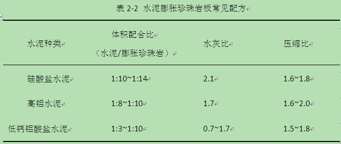 水泥膨脹珍珠巖保溫板是以膨脹珍珠巖為輕質(zhì)骨料,多種水泥為粘結(jié)劑,并輔以適量的添加劑,按一定配比進行混料,經(jīng)攪拌、成型、養(yǎng)護工藝制備而成。使用的水泥主要包括硅酸鹽水泥、高鋁水泥、低鈣鋁酸鹽水泥等。其常用常見配方如表2-2所示。