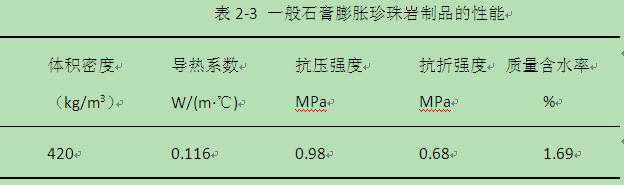 一般以天然石膏或化學石膏為膠凝劑,以粉煤灰、生石灰等作為摻合料,以膨脹珍珠巖作為輕質(zhì)骨料,以尼龍短纖維等作為增強材料,混合料經(jīng)攪拌、澆注成型、干燥等工藝制備而成的輕質(zhì)板材。它具有體積密度小、抗壓強度高、隔熱、隔聲、防火等性能,但防水性能較差,有專利介紹,將熔融的蠟質(zhì)材料如石蠟、瀝青等噴射到石膏漿中形成很細的石蠟或瀝青顆粒,可以提高石膏制品的耐水性能。一般石膏膨脹珍珠巖保溫板的性能如表2-3。