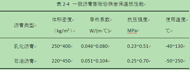 作為膨脹珍珠巖保溫板粘結(jié)劑的瀝青有兩種:石油瀝青和乳化瀝青。石油瀝青是固體或者半固體,故使用前需要加熱熔化,再將預熱好的膨脹珍珠巖加入并攪拌均勻,熱澆鑄成型。這種制品的防水性能較好,抗壓強度高,但體積密度也較大,保溫效果較差,制備工藝相對復雜,且會造成環(huán)境污染。乳化瀝青是瀝青和乳化劑在一定工藝作用下,生成的液態(tài)瀝青。在制備乳化瀝青膨脹珍珠巖保溫板時無需加熱熔化,僅在常溫下與骨料攪拌均勻,加壓成型即可,成型工藝簡單。乳化瀝青可以在膨脹珍珠巖顆粒表面形成一層瀝青薄膜,使制品具有防水功能,且不會造成污染環(huán)境。總體說來,瀝青膨脹珍珠巖保溫板防水性能優(yōu)異,可用在防水要求高的保溫領(lǐng)域,但其致命弱點是使用溫度低,燃燒性能差。常見的瀝青膨脹珍珠巖保溫板性能見表2-4。