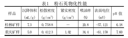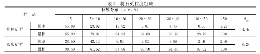 經(jīng)過加工后的粉石英產(chǎn)品是一種白色、淺白色微細(xì)粉體,分散性好,無結(jié)團(tuán)現(xiàn)象,手感細(xì)膩滑爽,密度2.55~2.65g/cm3,莫氏硬度7,折光率1.544,熱穩(wěn)定溫度為573℃,熔點(diǎn)為1 730℃,電絕緣性優(yōu)異,化學(xué)惰性高,耐酸腐蝕性能好。獨(dú)特的顆粒形態(tài)和粒度組成,賦予粉石英極低的吸油率和摩擦系數(shù),良好的粉散流動(dòng)性,因此,用作有機(jī)聚合物的填料,可明顯改善復(fù)合材料的加工工藝性能。兩種粉石英產(chǎn)品的基本物化性質(zhì)和粒度組成見表1、表2。