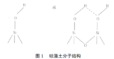 從硅藻土的化學(xué)結(jié)構(gòu)可知,硅藻土呈弱酸性,是一種固體酸,能夠與堿發(fā)生反應(yīng)。硅藻土表面的多孔性與負(fù)電性使其呈現(xiàn)明顯表面吸附性。,硅藻土表面還存在有大量的硅羥基及氫鍵,這些硅羥基及氫鍵同時(shí)存在于硅藻土眾多的微孔之中,這些也是硅藻土具備吸附性能的重要原因。其結(jié)構(gòu)見(jiàn)圖1。