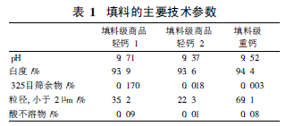 從表1的技術參數(shù)可以看出,3種填料的白度、pH相當,填料級商品輕鈣1的325目篩余物與酸不溶物含量稍高,填料級重鈣的酸不溶物含量稍高。