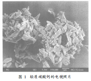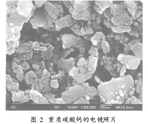 從圖1, 2的電鏡照片看出輕質碳酸鈣粒子大小形狀幾乎是一致的紡錘形絮聚結構,而重質碳酸鈣呈不規(guī)則立方體狀結構,均勻性較差,顆粒大小相差明顯。