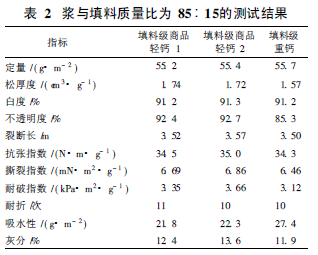 漿、填料的質量比分別為85/15、80/20、70/30時的測試結果見表2。