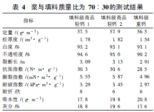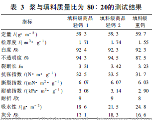 (3) 由灰分指標看,在相同填料用量時,填料級輕鈣比填料級重鈣的灰分高,主要是由于填料級重鈣的粒徑很小,在紙頁脫水成形時,纖維對細小顆粒截留差;而填料級輕鈣的粒徑較大,對紙張纖維有很好的架橋作用,故在灰分保留方面填料級輕鈣優(yōu)于填料級重鈣;