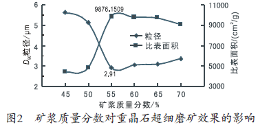2.1.3 礦漿質(zhì)量分數(shù)對重晶石粉超細磨礦的影響: