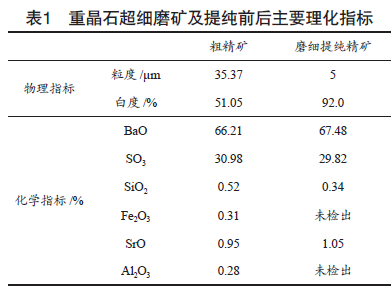 本實驗所用重晶石的主要致色物質(zhì)是表面薄膜鐵、硅酸鹽和碳酸鹽礦物,一般的物理提純方法無法去除。采用酸浸處理,利用酸與礦物表面附著的金屬或金屬氧化物進行反應(yīng),生成可溶于水或稀酸的化合物,再經(jīng)過濾和洗滌,將可溶物分離,從而達到除雜提純、提高礦物品位的目的。本試驗選用酸浸出劑為濃硫酸、氫氟酸和絡(luò)合劑,在一定的時間和溫度下進行酸浸攪拌處理。重晶石經(jīng)超細磨礦和酸浸提純處理后,其主要理化指標見表1。