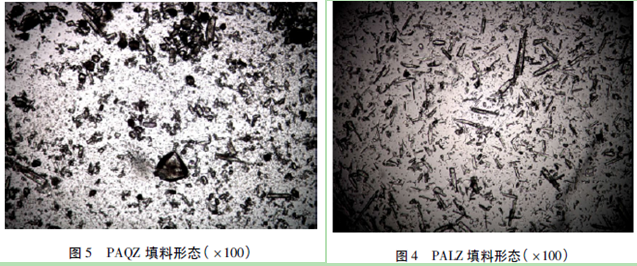 采用雷蒙磨、球磨機不同設(shè)備對同一批硅灰石加工,首先要了解的就是不同設(shè)備生產(chǎn)的硅灰石填料形態(tài)。試驗中采用光學(xué)顯微鏡對不同設(shè)備生產(chǎn)的樣品進行不同倍率的觀察,雷蒙磨樣品( PALZ) 如圖4 所示,球磨機生產(chǎn)的樣品( PAQZ) 如圖5 所示。