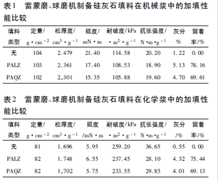 2. 2 雷蒙磨、球磨機制備的硅灰石填料紙張?zhí)砑釉囼灲Y(jié)果分析