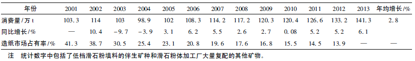 表1 2001—2013 年造紙滑石粉消費(fèi)量及增長率
