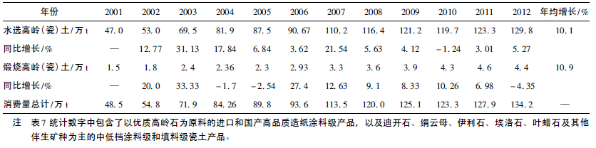 表1 2001—2012 年造紙高嶺( 瓷) 土消費(fèi)量及增長(zhǎng)率