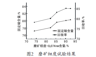 由圖2 可看出,隨著磨礦細(xì)度-0.074 mm 含量的增加,固定碳含量逐漸升高,-0.074 mm 含量占92.5%時固定碳含量達(dá)到最大,回收率在-0.074 mm 含量占90% 時達(dá)到最大,綜合考慮,-0.074 mm 含量占92.5%為最佳磨礦細(xì)度。