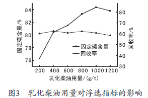 試驗捕收劑柴油在水中分散性不好,應(yīng)乳化后再使用,在水介質(zhì)中乳化柴油的小油珠粒徑可達(dá)幾微米甚至納米級別,為柴油與微細(xì)粒隱晶質(zhì)石墨作用創(chuàng)造了更好條件。磨礦細(xì)度-0.074 mm 含量為92.5%,不添加分散劑,起泡劑MIBC 用量為100 g/t,礦漿質(zhì)量分?jǐn)?shù)為10% 時,精礦固定碳含量、回收率隨乳化柴油用量變化見圖3。