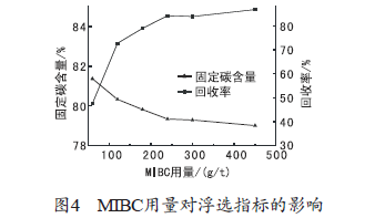 由圖4 可知,精礦固定碳含量隨著起泡劑增加逐漸降低,回收率大幅提高。當(dāng)MIBC用量為240 g/t 時,回收率達(dá)到85%,但精礦固定碳含量下降明顯,故后續(xù)MIBC 用量以120 g/t 為宜。起泡劑用量增大導(dǎo)致含水泡沫量增大,精礦水回收率增大,精礦固定碳含量降低,說明泡沫對脈石礦物的夾帶是影響隱晶質(zhì)石墨浮選指標(biāo)的重要因素,在保證一定回收率的情況下起泡劑用量宜少。