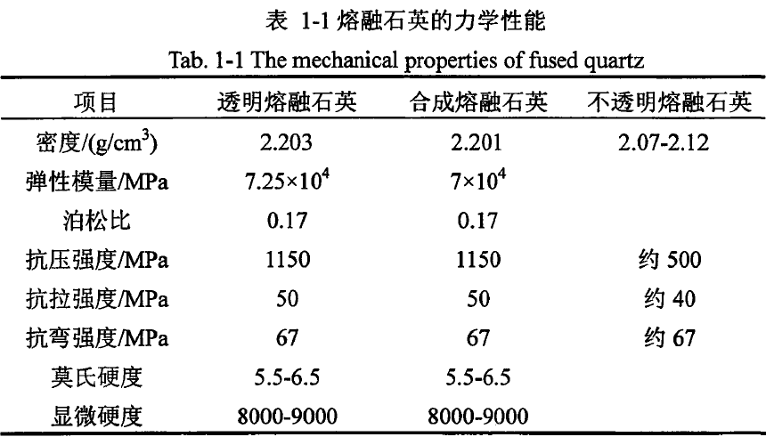 力學(xué)性能:熔融石英是脆硬材料,其抗拉強(qiáng)度很低而抗壓強(qiáng)度很高,后者是前者的20倍。表1-1給出了 融石英的力學(xué)性能數(shù)據(jù)。熔融石英性能測試與試樣的內(nèi)在質(zhì)量和表面狀態(tài)關(guān)系密切,一些缺陷和表面粗糙度對(duì)測試結(jié)果都會(huì)有很大影響。