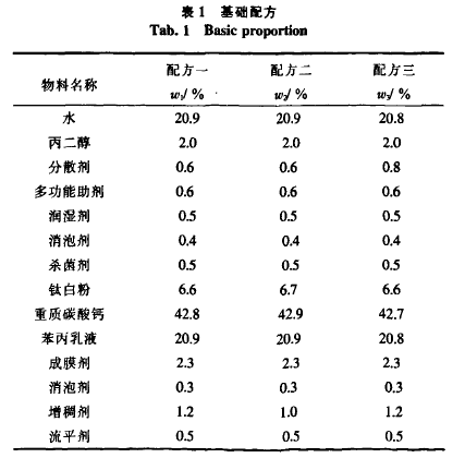 為檢測不同重質(zhì)碳酸鈣粉在涂料中的應用特性,設置了以重質(zhì)碳酸鈣粉為主要體質(zhì)顏料的外墻涂料基本配方,如表1。