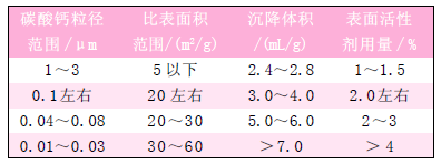 (1)普通輕質(zhì)碳酸鈣的沉降體積要明顯小于納米碳酸鈣的沉降體積,活性輕質(zhì)碳酸鈣表面改性所需要消耗的表面活性劑要明顯小于活性納米碳酸鈣表面改性所需表面活性劑,這都是因為納米碳酸鈣比普通輕質(zhì)碳酸鈣具有更大的比表面積。碳酸鈣粒徑與沉降體積和表面活性劑(以硬酯酸鈉為例)用量的關(guān)系如表1。