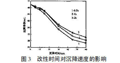 分散性是表征這一性能的重要措施。對(duì)粒子潤(rùn)濕性好的液體, 粒子能在其中很好分散, 粒子不易粘結(jié)聚集, 沉降速度慢;反之, 粒子分散性差, 易聚集, 沉降速度快。因此,可以用沉降速度來(lái)評(píng)價(jià)改性效果。