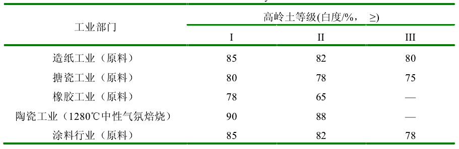 表1 各工業(yè)部門對高嶺土白度的要求