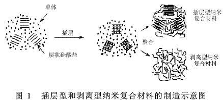 按其插層復(fù)合過(guò)程,可分為聚合物插層型和插層聚合型兩類(lèi)。而根據(jù)納米材料的最終復(fù)合形式,又可分為插層型納米復(fù)合材料和剝離型納米復(fù)合材料2種,二者在性能上有較大的差別。在插層型納米復(fù)合材料中,層狀硅酸鹽層間距雖然有所擴(kuò)大,片層有所解離,但仍保持一定量片層的相對(duì)有序性;在剝離型納米復(fù)合材料中,硅酸鹽片層完全被單體或聚合物解離,無(wú)序分散在聚合物基體中的是硅酸鹽單元片層,此時(shí),硅酸鹽粘土與聚合物實(shí)現(xiàn)了納米單元片層的均勻混合,剝離型是插層型分散的最終形式。