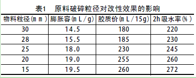 由表1可以看出,該膨潤土礦樣在不同粒徑加工后,從各粒徑試樣的吸水率、膨脹容和膠質(zhì)價觀察,在粒徑小于25mm后,隨著粒徑變細,膨脹容指標測試結(jié)果逐漸增大,但增大效果不顯著;試樣的吸水率隨粒徑變化不明顯。由此可見,原礦進行破碎篩分對改性效果的選擇性不高,即只要將原料中大的石塊去除即可。在此,選擇原礦破碎篩分粒徑為25mm。