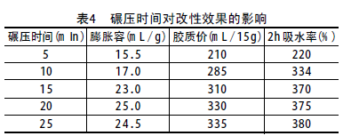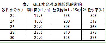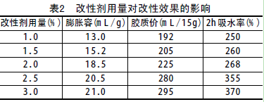 從表2可以看出,改性劑用量在2.0%以下時,各測試數(shù)值增加不明顯。隨著改性劑用量的增加,當達到2.5%時,吸水率指標有了很大提高,膨脹容和膠質(zhì)價指標也發(fā)生明顯的增大趨勢。綜合考慮經(jīng)濟成本,改性劑用量宜選用2.5%。