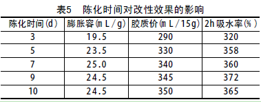 鈣基膨潤土經(jīng)碾壓改性后,還需有一定陳化時間,使離子交換反應進行的更加充分,即鈉化效果達到最佳狀態(tài)。由以上數(shù)據(jù)顯示,隨陳化時間增加,膨脹容指標表現(xiàn)明顯,當陳化時間達到7d,指標表現(xiàn)良好,再延長陳化時間,指標增加不明顯。鑒于以上結(jié)果,選擇陳化時間為7d。