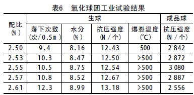 根據(jù)以上工業(yè)試驗,選擇最佳工藝條件進行大批量連續(xù)生產(chǎn),產(chǎn)品指標得到很好控制,質(zhì)量也相對比較穩(wěn)定。將所生產(chǎn)成品發(fā)往某球團廠進行工業(yè)試用研究,經(jīng)過使用,對方表示產(chǎn)品使用效果良好,相對以前所供球團土指標較好,質(zhì)量穩(wěn)定。配比為2.55%左右,其氧化球團工業(yè)試驗數(shù)據(jù)如表6所示。