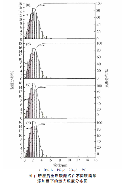 硬脂酸添加量下的激光粒度分布。由圖1 可見,經(jīng)過研磨后,產(chǎn)品峰值粒度為2 μm,粒度主要分布在0~6 μm 區(qū)間,粒度分布范圍窄,基本符合高斯分布。與原始的45 μm 顆粒相比,重質(zhì)碳酸鈣產(chǎn)品的顆粒明顯減小。從累計粒度分布看,當(dāng)硬脂酸的添加量( 質(zhì)量分數(shù), 下同) 分別為0%、1%、2%、3%時, 粒度≤4.24 μm 的顆粒分別占98.4%、98.4%、98.99%、98.53%。說明隨著硬脂酸的添加,一定程度上起到了助磨效果,使重質(zhì)碳酸鈣的粒度略有減小。但從總體上看,硬脂酸的添加量對產(chǎn)品的粒度分布影響不大。