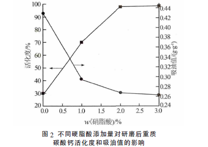 圖2 為不同硬脂酸添加量對改性重質(zhì)CaCO3的活化度和吸油值的影響。