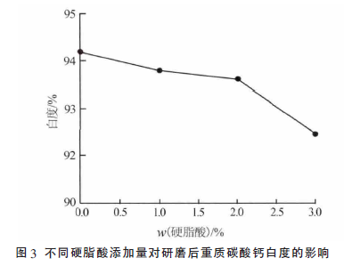 圖3 為不同硬脂酸添加量對改性重質(zhì)CaCO3白度的影響。