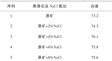 由圖1可知,NaCl 的加入對(duì)于燒滑石白度的提升是有一定的作用。不過如果混料不均勻,容易導(dǎo)致燒滑石出現(xiàn)黃白不均,從而導(dǎo)致燒滑石外觀品質(zhì)很差。同時(shí),也有許多廠家拒絕使用含鈉元素的燒滑石,這也使得產(chǎn)品增白后其使用范圍受到了限制。