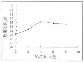從(1)式可知,生成的FeCl3為氣體易從原料中揮發(fā)掉,從而達(dá)到了降低了滑石中的鐵含量的目的。有學(xué)者對(duì)某地黑滑石添加不同NaCl用量對(duì)燒滑石白度的影響,如表1所示,其具體分析如圖1所示。