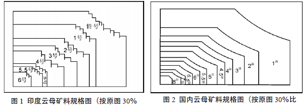 印度是世界上最大的云母出口國(guó)。圖1、圖2 對(duì)比印度和國(guó)內(nèi)規(guī)格標(biāo)準(zhǔn),二者略有差別。由于國(guó)內(nèi)云母片礦料面臨枯竭,大部從印度進(jìn)口,其質(zhì)量標(biāo)準(zhǔn)影響了我國(guó)云母片的選料,并往往引發(fā)進(jìn)口企業(yè)與印度出口商的貿(mào)易爭(zhēng)執(zhí)。
