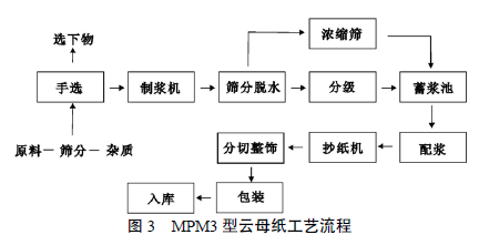 后者直接水力制漿。圖 3 介紹了MPM3 型云母紙的工藝流程。經(jīng)水力破碎漿的鱗片狀云母,在配漿池按鱗片大小和比例調(diào)配,然后泵入抄紙機(jī)。造紙機(jī)一般為圓網(wǎng)和長(zhǎng)網(wǎng),低速運(yùn)行。云母鱗片之間靠范德化力和靜電吸引在紙機(jī)壓榨作用下強(qiáng)制性相互聯(lián)接經(jīng)烘缸轉(zhuǎn)動(dòng)加熱形成紙頁(yè)。