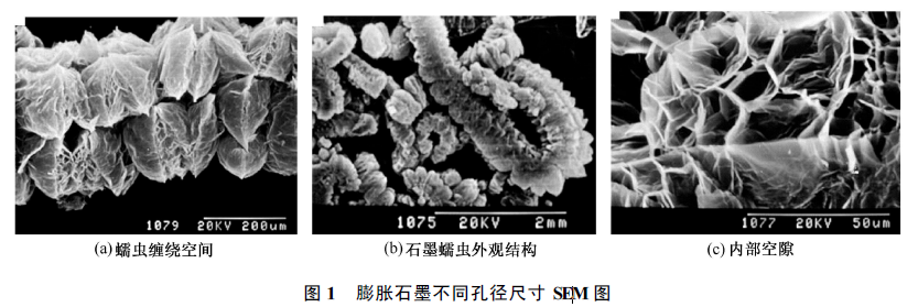 制備膨脹石墨的第1 道工序是讓天然鱗片石墨與氧化劑發(fā)生反應(yīng), 所用氧化劑一般為強(qiáng)氧化劑, 如過氧化氫、重鉻酸鉀, 它們的氧化能力可消除鱗片石墨層間作用力, 其平面大分子因被氧化而荷正電,邊緣相鄰層面的碳原子相互排斥, 使層間距加大, 從而使石墨層間打開。第2 道工序是加入酸類物質(zhì),如濃硫酸、高氯酸等作為插入劑, 在石墨層間已經(jīng)打開的情況下, 加入酸類物質(zhì)一是作為維持氧化劑酸性的試劑;二是作為形成石墨層間化合物的插入劑, 形成石墨層間化合物。第3 道工序是高溫膨化,在1000℃左右的瞬間高溫處理下, 已干燥的石墨層間化合物會(huì)快速分解, 產(chǎn)生的推動(dòng)力克服石墨C軸方向C—C 之間較弱的范德華力, 使石墨沿C軸方向劇烈膨脹為蠕蟲狀, 即得到膨脹石墨, 體積可膨脹為原來的百倍到數(shù)百倍, 外觀如蠕蟲狀, 由許多粘連、疊合的石墨鱗片構(gòu)成, 而片間又有許多蜂窩狀的微細(xì)孔隙構(gòu)成, 該空隙是高溫膨脹爆破所致。用高倍數(shù)SEM 觀察對(duì)膨脹石墨蠕蟲空腔、外觀結(jié)構(gòu)及內(nèi)部空隙, 見圖1 。