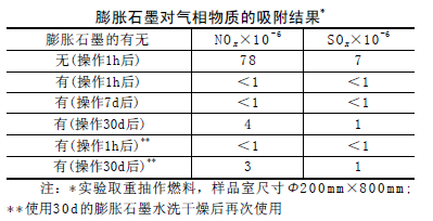 工業(yè)廢氣及汽車尾氣對(duì)大氣污染的主要成分為燃燒所放出的SOx和NOx,而膨脹石墨對(duì)其有著較好的吸附脫除效果。國外曾有資料介紹這方面的數(shù)據(jù),見下表。