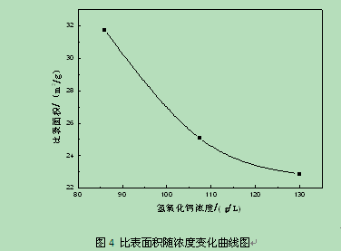 由圖4可以得知:隨著石灰乳濃度的增大,碳化產(chǎn)物的顆粒粒徑增大,比表面積減小??紤]到Ca(OH)2乳液的濃度對碳化裝置的生產(chǎn)能力有著明顯的影響,當(dāng)石灰乳濃度過低時明顯對設(shè)備要求相對提高,所以應(yīng)該從技術(shù)、經(jīng)濟(jì)兩個角度權(quán)衡,選擇86g/L的氫氧化鈣濃度制備納米碳酸鈣較適宜。