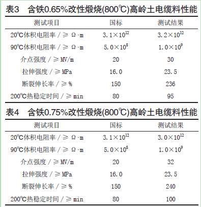 不同煅燒溫度和不同含鐵量的改性煅燒高嶺土生產(chǎn)的電纜料,在江蘇徐州銅山電纜廠使用,表面光潔度好,但電性能有很大差別。各種性能檢測(cè)結(jié)果見表1~4。