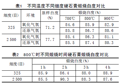 硬石膏的最佳煅燒溫度在試驗(yàn)室為800℃左右,在實(shí)際生產(chǎn)中為850℃左右,煅燒后石膏的白度可以達(dá)到93%左右。