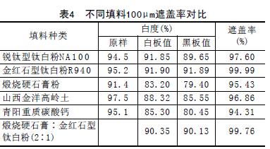造紙、涂料行業(yè)為提高遮蓋性能、光散射性能、改善外觀、降低成本等,大量使用無(wú)機(jī)礦物填料,目前主要使用的是鈦白粉、煅燒高嶺土、滑石粉、碳酸鈣等。超細(xì)硬石膏粉經(jīng)適當(dāng)煅燒后,白度增高,并成為一個(gè)充滿孔隙的結(jié)構(gòu),光散射系數(shù)有了很大的提高,這一特性可賦予紙張較高的不透明度,既可代替昂貴的鈦白粉用于輕量涂布和未漂漿原紙的涂布,又可明顯提高涂層的油墨吸收性,同時(shí)對(duì)紙張的光澤度無(wú)不利的影響,加上煅燒超細(xì)硬石膏粉比其他填料硬度低、磨耗值小,用于生產(chǎn)涂布紙,高速、多彩印刷是非常有利的。煅燒硬石膏粉遮蓋率與高嶺土、重質(zhì)碳酸鈣等填料遮蓋率對(duì)比數(shù)據(jù)見表4。
