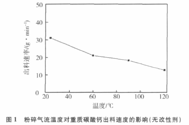 圖 1 所示為無(wú)改性劑溶液條件下粉碎氣流溫度對(duì)重鈣粉的出料速率影響。 從圖中可以看到,隨著粉碎氣流溫度的升高,重鈣粉的出料速率減小。 這是由于,當(dāng)粉碎氣流溫度升高后,氣體密度降低,粉碎時(shí)的氣體質(zhì)量減少,從而降低了氣流粉碎過(guò)程中的粉碎能量。