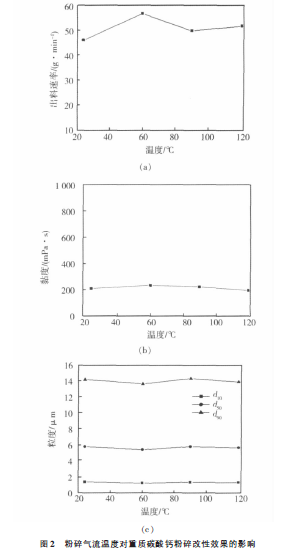 在一體化過(guò)程實(shí)驗(yàn)中,首先研究了粉碎氣流溫度 對(duì)重鈣粉碎與表面改性效果的影響,結(jié)果見(jiàn)圖 2。實(shí)驗(yàn) 過(guò)程中改性劑溶液流量為 1.5 mL/min,改性劑溶液中 鈦酸酯偶聯(lián)劑的質(zhì)量分?jǐn)?shù)為 50%, 溶劑為無(wú)水乙醇。 從圖 2(a)中可以看到,隨著粉碎氣流溫度的升高,重鈣粉體的出料速率是先增大而后又有所減小。 這表 明,當(dāng)粉碎氣流溫度較低時(shí),改性劑的助磨效果影響 大于因粉碎氣流溫度升高引起粉碎能量降低的影 響。 而當(dāng)粉碎氣流溫度較高時(shí),改性劑的助磨效果影 響要小于因粉碎氣流溫度升高而引起粉碎能量降低 的影響。 因此,在一體化過(guò)程中需要合理選擇粉碎氣 流的溫度,本實(shí)驗(yàn)范圍內(nèi),其最佳的粉碎氣流溫度為60 ℃。 從圖 2(b)、(c)中可以看到,粉碎氣流溫度對(duì)重鈣的改性效果以及粒度特性影響不大。