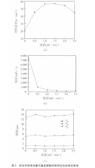 但隨著改性劑溶 液流量的繼續(xù)增大, 重鈣-液體石蠟體系的黏度變化并不明顯,趨于一穩(wěn)定值,表明改性后的重鈣粉與液 體石蠟的相容性變化也不明顯。 這是由于隨著改性劑溶液流量的增大, 吸附在重鈣粉表面的改性劑增多,從而改善了重鈣粉與液體石蠟的相容性,當(dāng)改性 劑在重鈣粉表面形成了一層包覆后, 其與液體石蠟的相容性達(dá)到最優(yōu)。 如果繼續(xù)增加改性劑,改性劑會(huì) 在重鈣粉表面形成多層吸附, 其改性的效果就不明 顯了。 從圖 3(c)中可以看到,改性劑溶液流量對(duì)重鈣 粉的粒度特性影響不大。