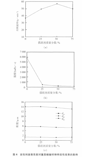圖 4 所示為改性劑溶液濃度對(duì)重鈣粉碎與表面改 性效果的影響。 實(shí)驗(yàn)過(guò)程中粉碎氣流溫度為 60 ℃,改 性劑溶液流量為 1.5 mL/min,溶劑為無(wú)水乙醇。 從圖 4(a)中可以看到,當(dāng)無(wú)水乙醇噴入粉碎腔后,重鈣粉體 的出料速率從 21.0 g/min 增大到 36.7 g/min, 出料速 率增加了 43%, 表明無(wú)水乙醇具有一定的助磨效果。 隨著改性劑溶液濃度的增加,重鈣粉的出料速率是先增大而后有所減小。 這可能是由于在同一改性劑溶液 流量條件下,隨著改性劑溶液濃度的增大,一定量的 改性劑在重鈣粉表面吸附后, 改善了重鈣粉的流動(dòng)性 從而提高了重鈣粉的出料速率。 但隨著改性劑溶液濃 度的提高,過(guò)多的改性劑在重鈣顆粒表面吸附,會(huì)降低 重鈣粉的流動(dòng)性,進(jìn)而降低重鈣粉的出料速率。 因此, 有一最佳的改性劑溶液濃度,在本實(shí)驗(yàn)范圍內(nèi),其最佳 值是改性劑溶液中偶聯(lián)劑的質(zhì)量分?jǐn)?shù)為 50%。 重鈣粉 體的出料速率從 36.7 g/min 增大到56.7 g/min, 出料速 率增加了 54%。 從圖 4(b)中可以看到,隨著改性劑溶 液濃度的增大, 改性后重鈣-液體石蠟體系的黏度急 劇下降,表明改性后的重鈣粉與液體石蠟的相容性得 到了很好的改善。 但隨著改性劑溶液濃度的繼續(xù)增大,重鈣-液體石蠟體系的黏度變化并不明顯,趨于一 穩(wěn)定值, 這表明當(dāng)改性劑在重鈣粉表面形成了一層包 覆后,其與液體石蠟的相容性達(dá)到最優(yōu)。 如果再繼續(xù)增 加改性劑,改性劑就會(huì)在重鈣顆粒表面形成多層吸附, 其改性的效果就不明顯了。 從圖 4(c)中可以看到,改性劑溶液濃度對(duì)重鈣粉的粒度特性影響不大。